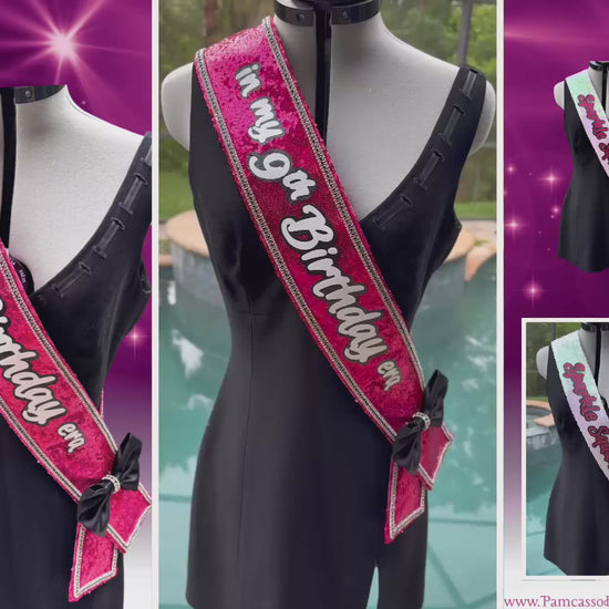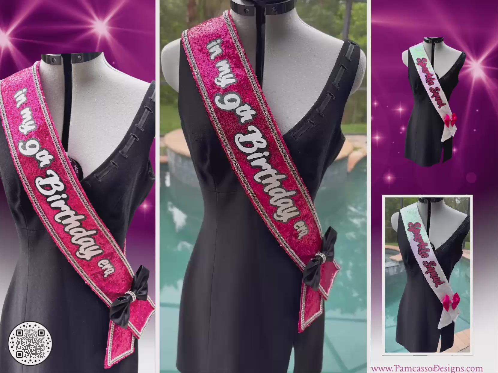 Get ready to party in glitz and glamour with the Birthday Squad Sequin and Rhinestone Celebration Sash! The star of the show rocks a sash that's a bling-tastic explosion of hot pink sequins, with white and black rhinestones twinkling like stars, and bold white glitter letters. The cherry on top? A sleek black satin bow with a rhinestone center. But wait, there's more! The party crew gets to dazzle too, sporting iridescent white sequin sashes with sassy hot pink glitter writing and matching bows that scream fabulous with rhinestone flair. It's the ultimate way to make birthdays shine brighter than ever!