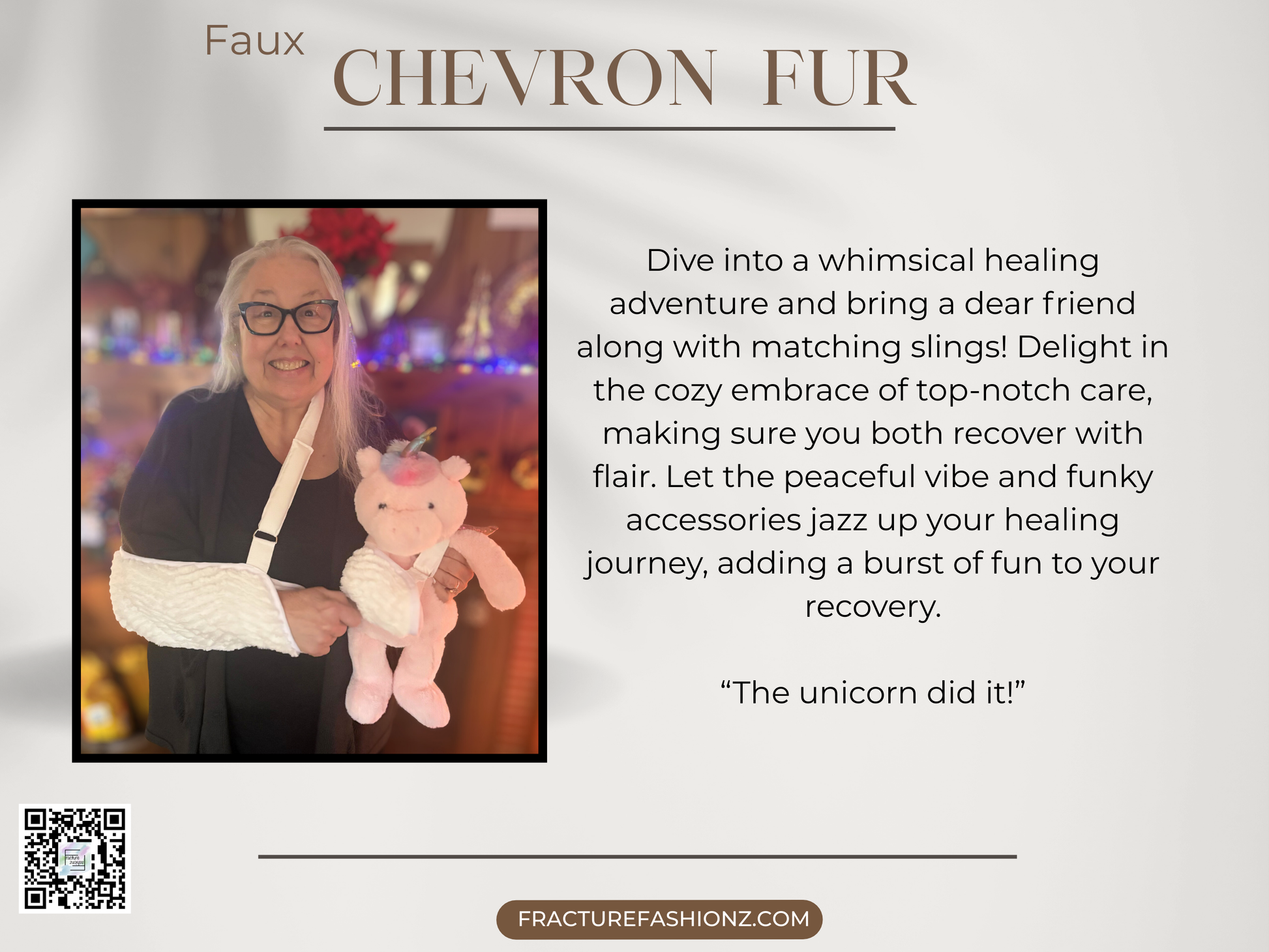 Heal in style with a lavish faux fur arm sling featuring an elegant white chevron design. Let this luxurious faux fur arm sling not only provide comfort and support but also add a touch of elegance to your healing journey. The chic white chevron design brings a stylish twist to traditional medical accessories, allowing you to heal in style. Embrace both comfort and fashion as you recover, showcasing your unique flair even during moments of rest. Let this arm sling be a statement piece that reflects your resilience and sophistication as you navigate through this period of healing.