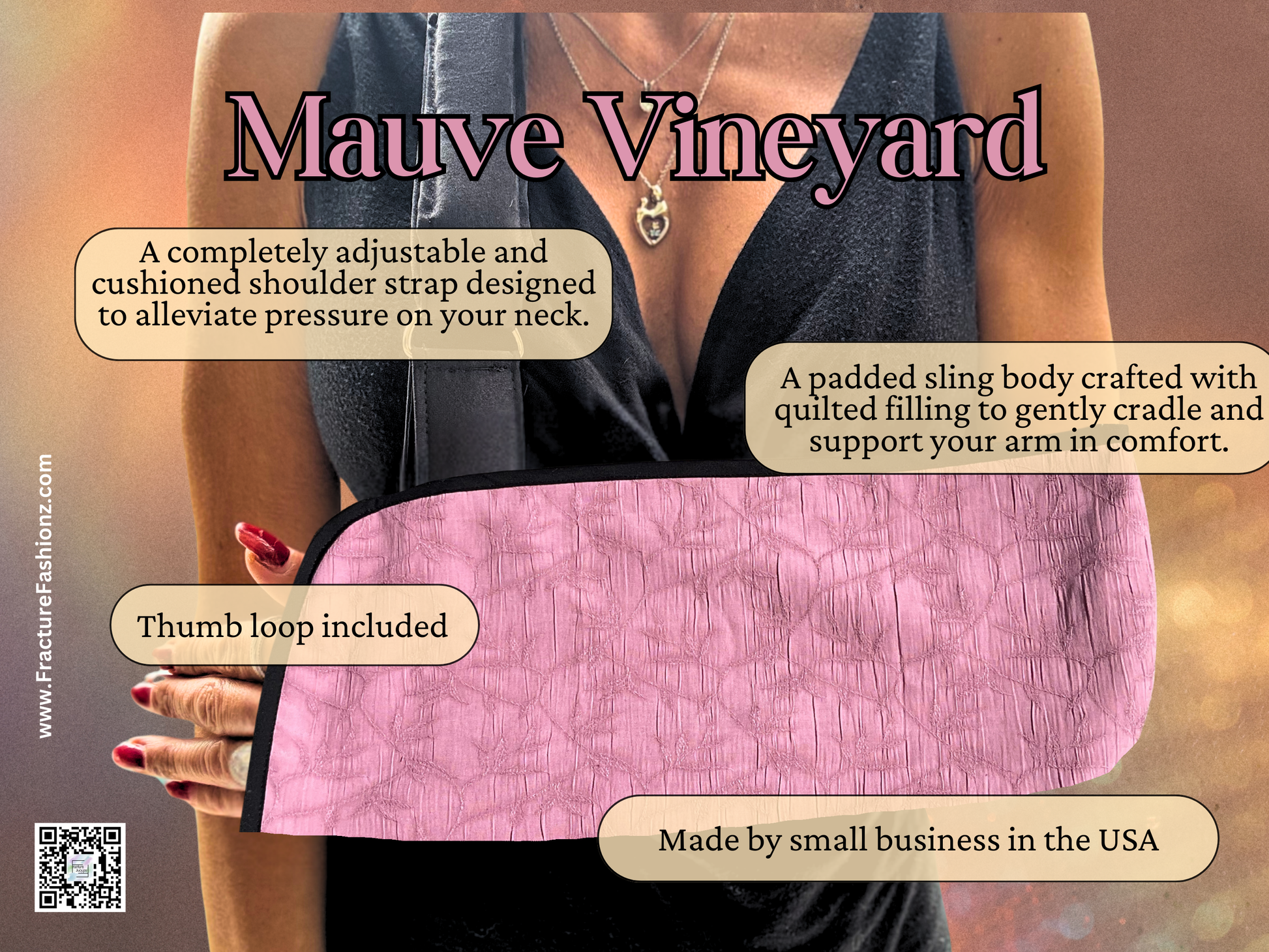 Fracture Fashionz arm slings can be worn on either the right or left arm and is made of a soft, padded, sling body with a completely cushioned strap. No more nylon straps digging in to your neck!