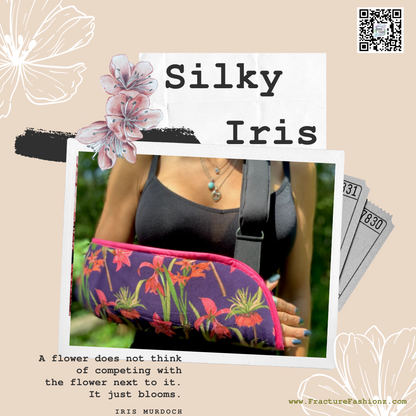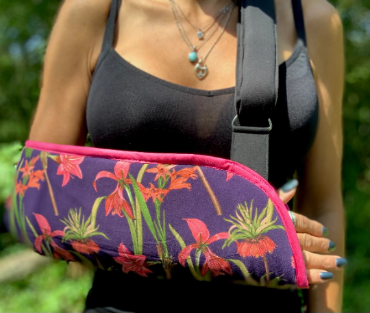 This padded arm sling by Fracture Fashionz features a beautiful iris design on silky fabric. The perfect balance of style and comfort, it offers the necessary support for an injured arm. Elevate your recovery with this fashionable and functional arm sling.
