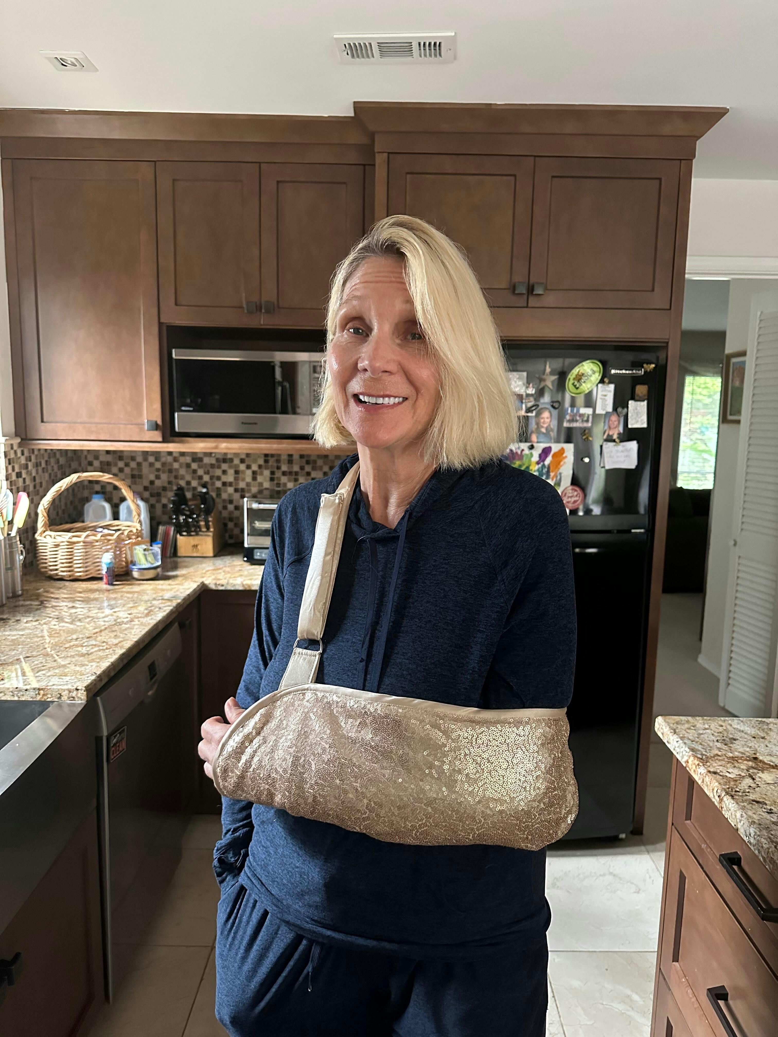 Fracture Fashionz arm slings can be worn on either the right or left arm and is made of a soft, padded, sling body with a completely cushioned strap. No more nylon straps digging in to your neck!