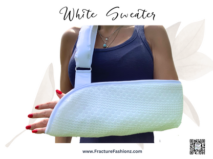 Be stylishly supported with Fracture Fashionz's White Sweater Arm Sling. Made from a soft, padded material, this sling is as cozy as it is functional. Perfect for those who want to heal in style!